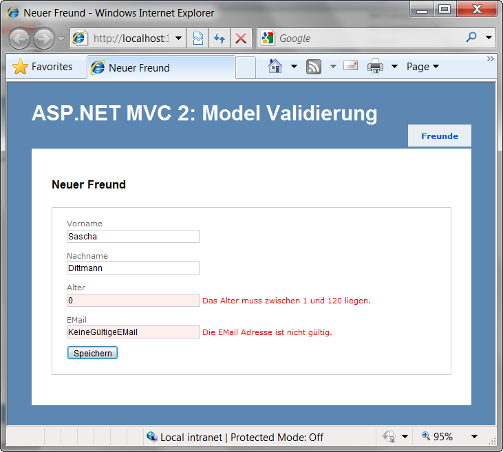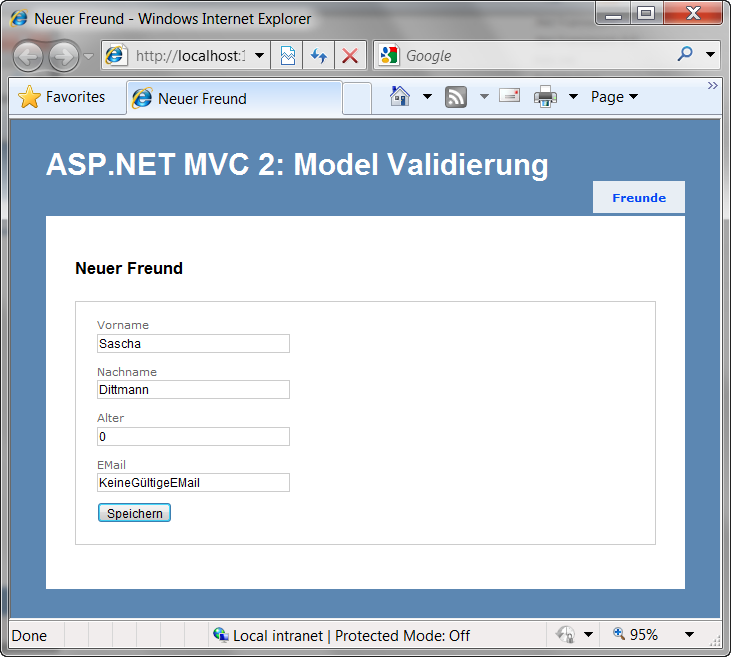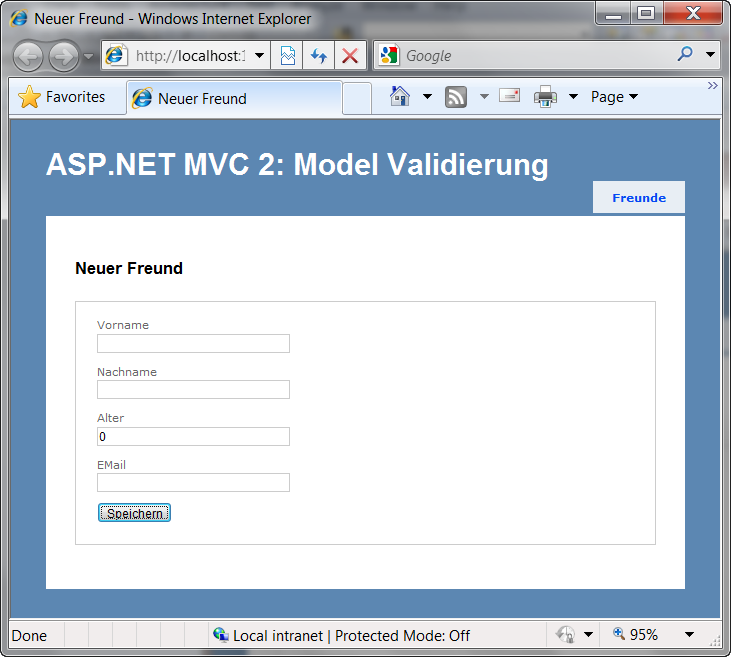 An folgendem Beispiel möchte ich Ihnen die neuen Möglichkeiten der Validierung mit Datenanmerkungen aufzeigen. Ich gehe hierbei von einem einfachen CRUD Szenario aus, welches ein Formular für die Eingabe von Freunden enthält: