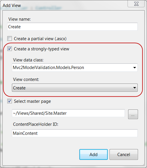 Die Fehlermeldungen werden durch die <%= Html.ValidationMessageFor() %> Hilfsmethoden in der Create.aspx View angezeigt.