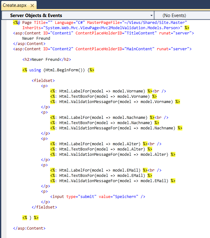 Visual Studio erzeugt nun das Grundgerüst für das Formular (Create.aspx) im ViewsFreunde Verzeichnis des Projektes. Neu in ASP.NET MVC 2 sind die Stark Typisierte HTML Hilfsmethoden die hierbei verwendet werden.