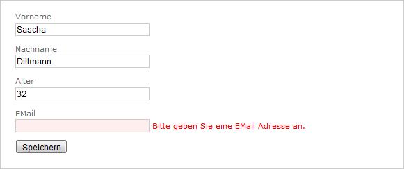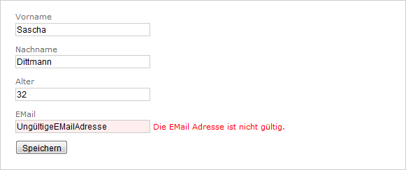 Für die Client-Seitige Validierung mussten wir kein eigenes JavaScript schreiben, und unsere Validierungsregeln liegen weiterhin an einer zentralen Stelle (in der “Person” Model-Klasse) auf dem Server.