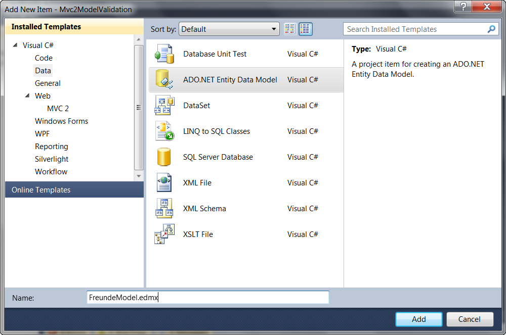 Visual Studio 2010 liefert mit dem Entity Framework 4 (EF) auch einen O/R Mapper mit, der nun auch POCO Klassen verarbeiten kann. Hierzu muss als erstes ein ADO.NET Entity Model dem Projekt hinzugefügt werden: