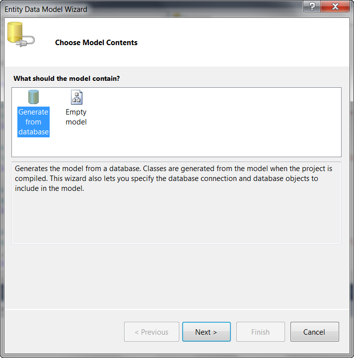 Als nächstes hat man die Auswahl die EF-Model-Objekte aus bestehenden Tabellen bzw. Sichten einer Datenbank generieren zu lassen oder mit einem leeren Model zu starten. Bei einem leeren Model kann man, nach dem manuellen Erstellen der Objekte, die zugehörigen Datenbankskripte erzeugen lassen.