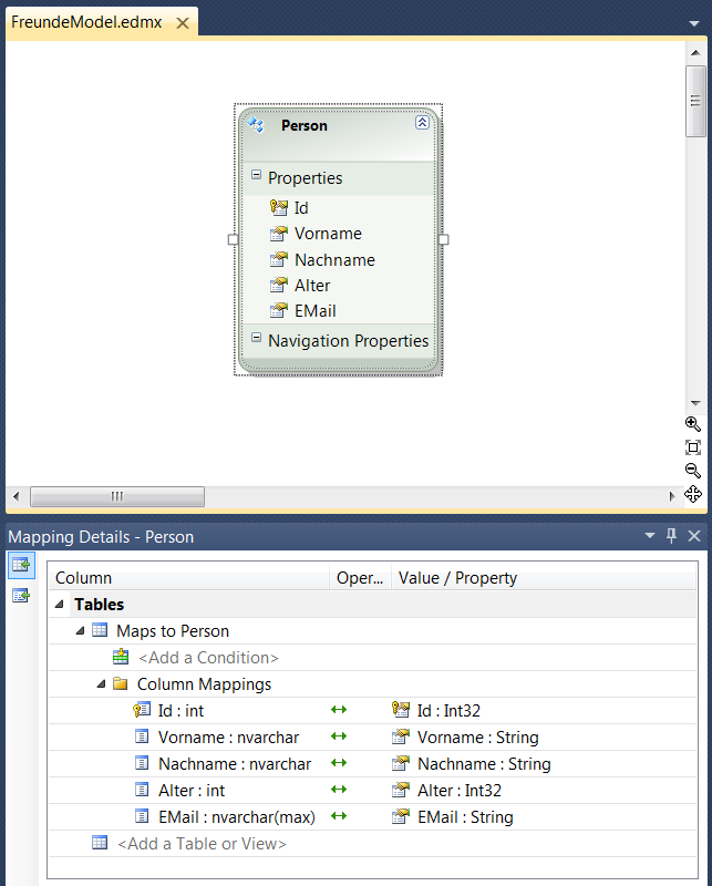 Der nächste Screenshot zeigt die “Person” Klasse im ADO.NET EF Designer in Visual Studio 2010. Der obere Fensterteil definiert die Person Klasse. Der untere Fensterteil zeigt den Mapping Editor der die Eigenschaften der Klasse mit den Feldern der Datenbanktabelle verbindet.
