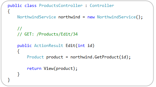 Beispiel: Gehen wir von einer einfachen “ProductsController” Klasse aus, welche eine “Edit” Aktion zum bearbeiten des “Product” Models beinhaltet: